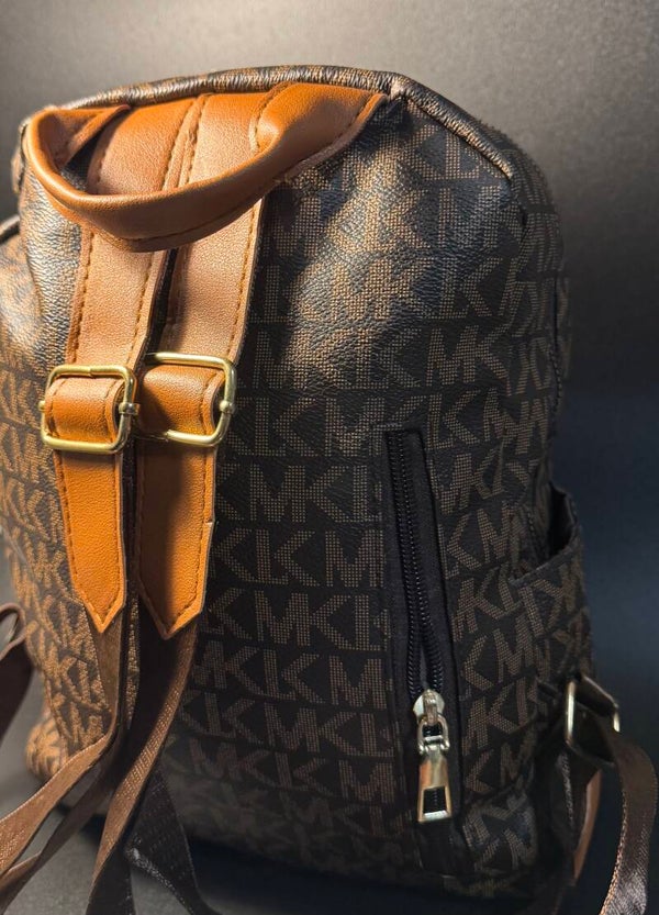 This brown backpack features a stylish monogram pattern and durable leather-like accents, making it a versatile choice for any occasion. Its classic design ensures both functionality and fashion, perfect for carrying essentials with ease.