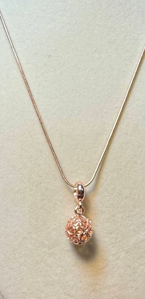 This stunning rose gold necklace features a delicate filigree pendant with swirling heart-like patterns, creating a romantic and vintage-inspired look. The openwork design offers a light and airy feel, beautifully showcasing the intricate craftsmanship. Perfect for adding a touch of elegance to any ensemble. 18"
