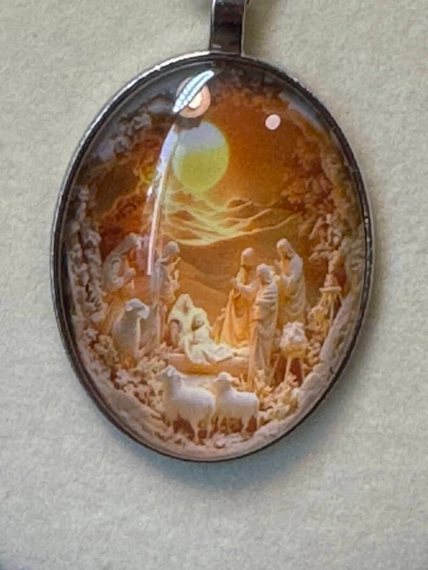 Elegant necklace featuring an oval pendant with a nativity scene. The pendant showcases warm orange and brown tones. 20"