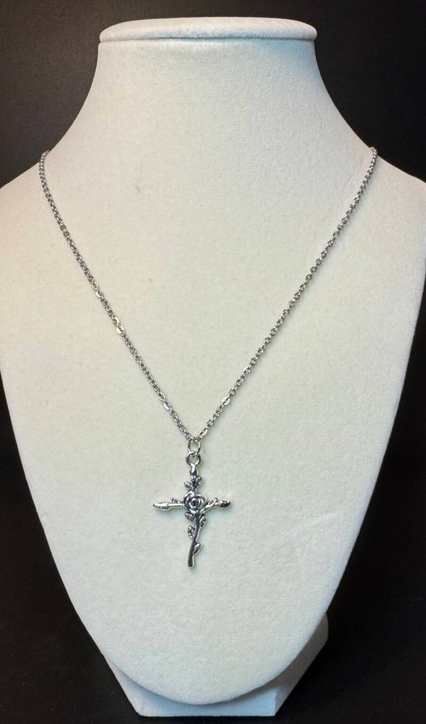 Elegant silver stainless steel cross pendant featuring a detailed rose design. Perfect for adding a touch of sophistication to any outfit. 22”