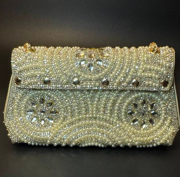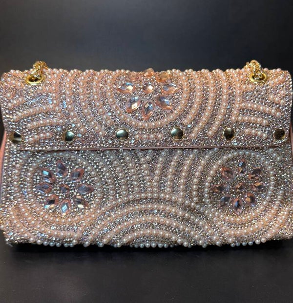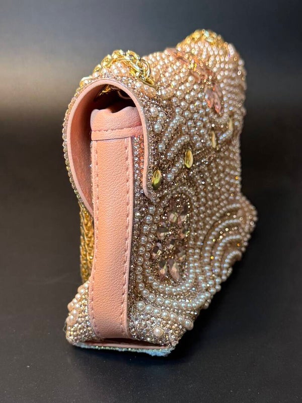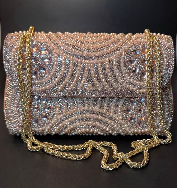 This stunning gold beaded clutch is perfect for any special occasion. Its intricate design and shimmering finish make it a standout accessory. Elevate your style with this elegant piece. Available in gold and pink.