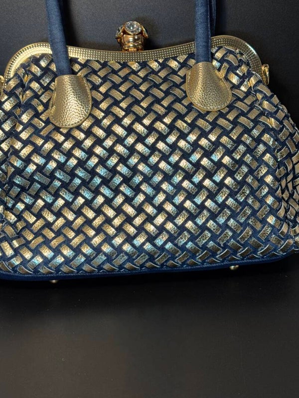 This stunning women's bag features a rich blue fabric adorned with sparkling gold embellishments. Perfect for adding a touch of glamour to any outfit.