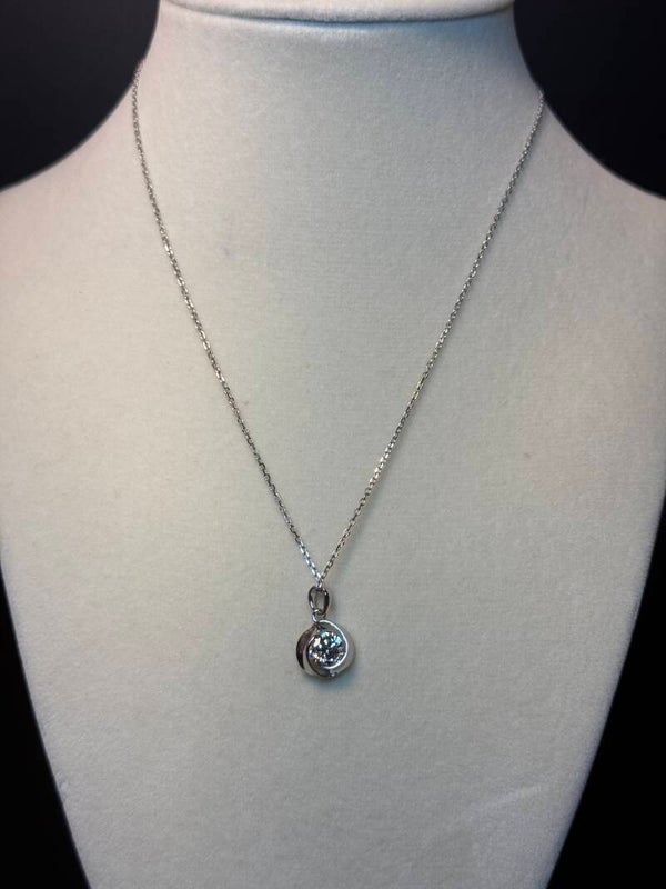 This 16 inch necklace features a delicate sterling silver chain with a beautiful round pendant, showcasing a clear 1 carat Moissanite in a classic bezel setting. Its elegant design makes it a versatile accessory for both casual and formal occasions.