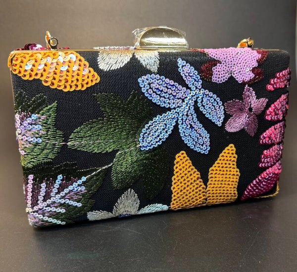 This elegant clutch features vibrant floral embroidery with sequins and stitching on a black background, complemented by a chic gold chain. Perfect for adding a pop of color to any outfit.