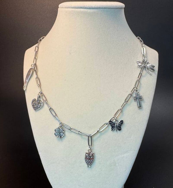 Silver Stainless Steel Charm Necklace with Butterfly Heart and Cross