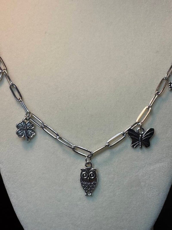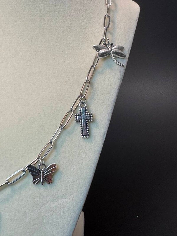 This silver 20" stainless steel necklace showcases a delicate chain adorned with charming pendants, including a butterfly, heart, and cross. The medium-length chain sits gracefully at the collarbone, offering a whimsical and balanced design. Perfect for adding a touch of nature and spirituality to any outfit.