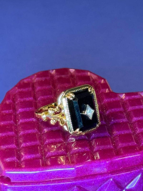 This stunning black and gold ring adds a touch of elegance to any outfit. Perfect for any occasion.
