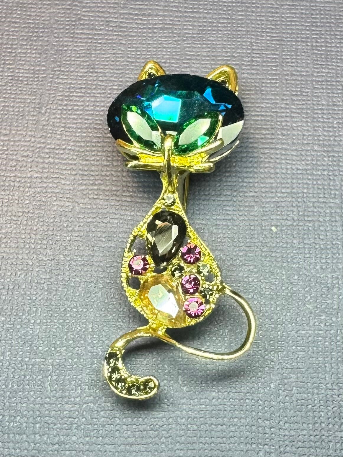 This exquisite gold cat keychain features vibrant gemstones in green, black, and pink hues. Perfect for adding a touch of elegance to any outfit.