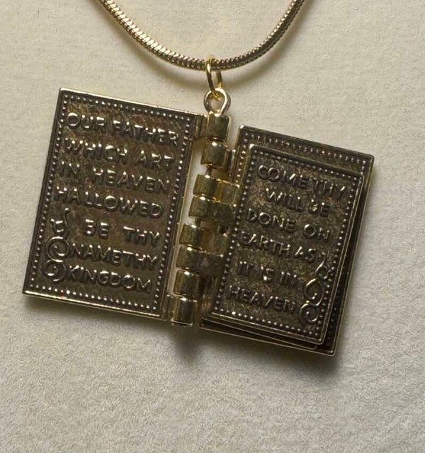 Elegant gold stainless steel bible pendant necklace featuring a unique book design. Perfect for adding a touch of sophistication to any outfit.