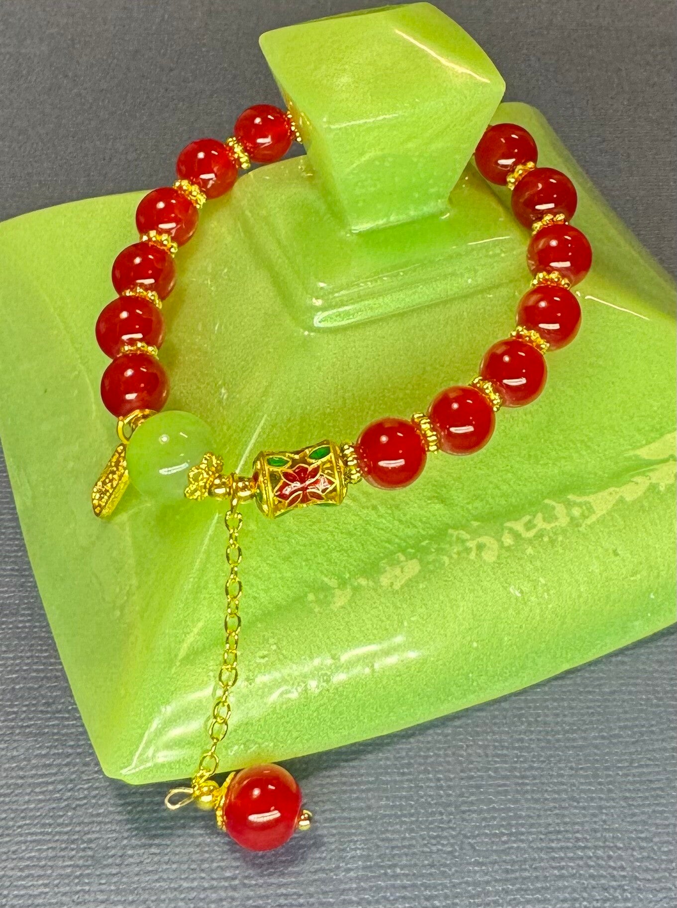 This stunning bracelet features vibrant red beads complemented by jade and elegant gold accents. Perfect for adding a touch of sophistication to any outfit.