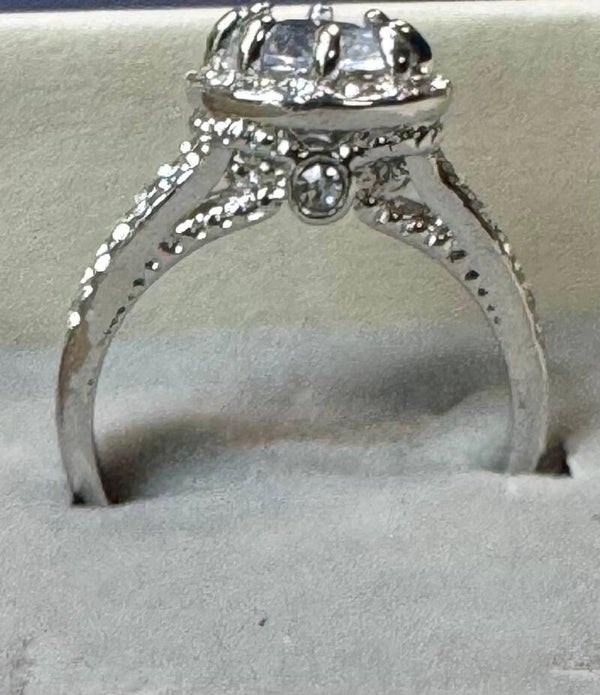This stunning sterling silver 2 carat Moissanite Diamond halo ring features a brilliant centerpiece surrounded by sparkling stones. Perfect for adding a touch of elegance to any outfit. Size 6