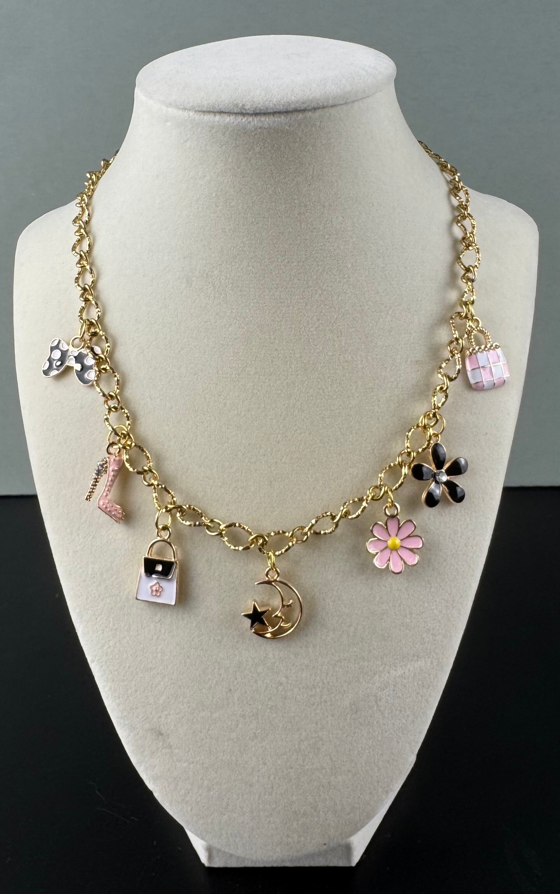 Elegant gold charm necklace featuring playful pink and black accents. Perfect for adding a touch of whimsy to any outfit.