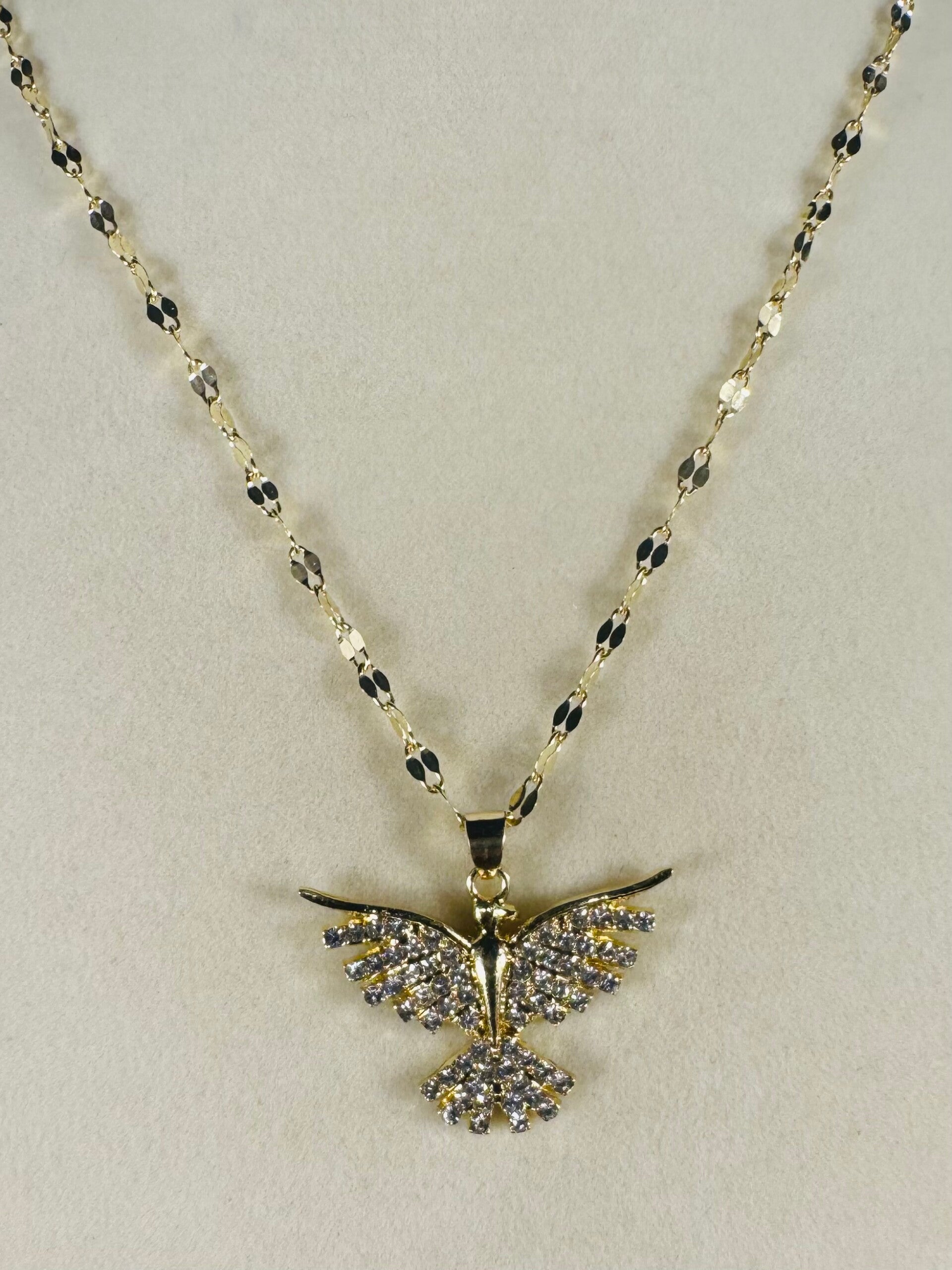 This exquisite 16” necklace showcases an eagle pendant with shimmering silver details. The luxurious gold stainless steel chain enhances its elegance, making it a perfect accessory for any occasion.