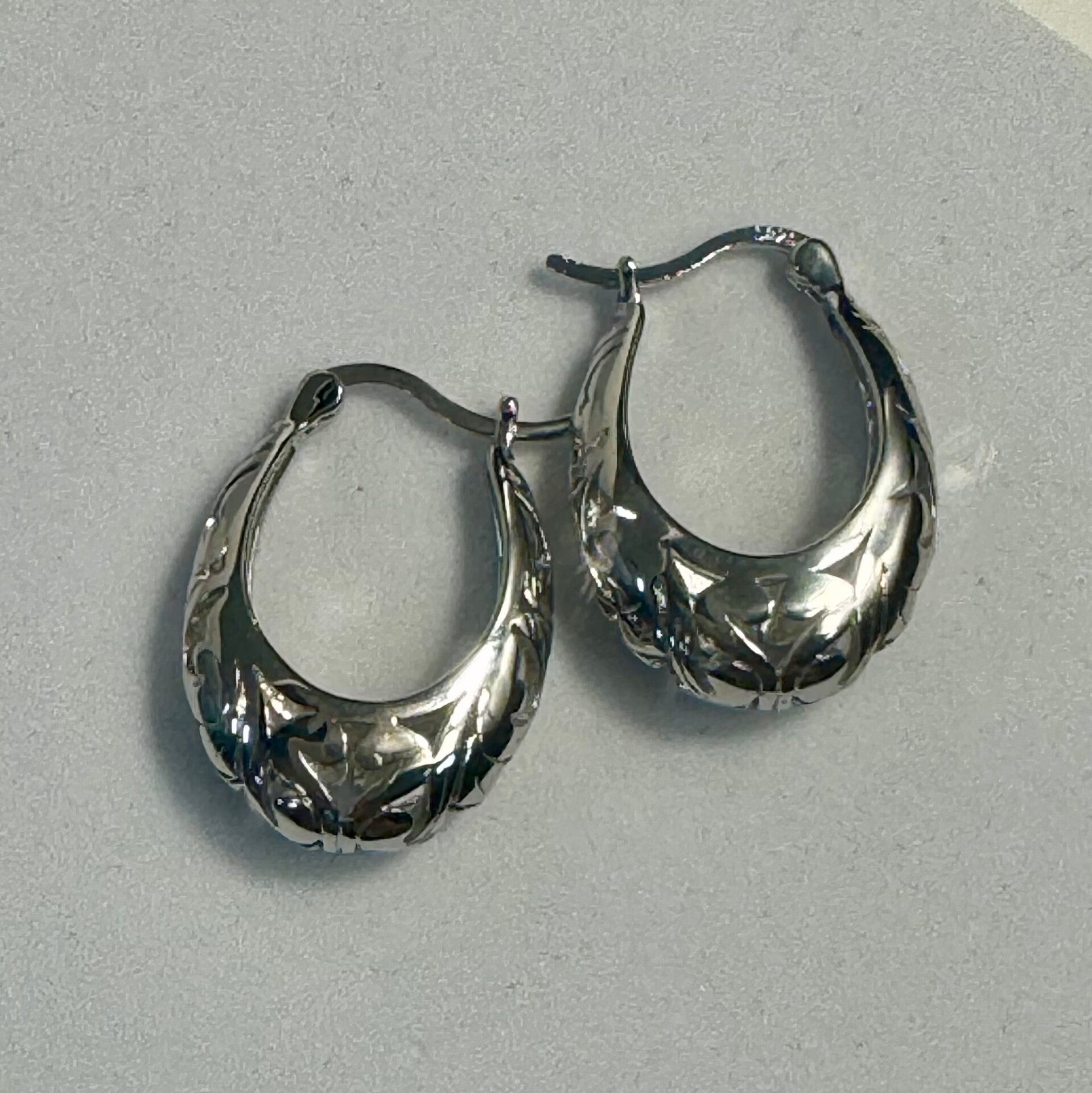 Polished sterling silver plated hoop earrings with an elegant engraved floral pattern. Lightweight and comfortable for everyday wear. Secure hinged clasp for easy on and off. Classic silver finish complements any outfit.