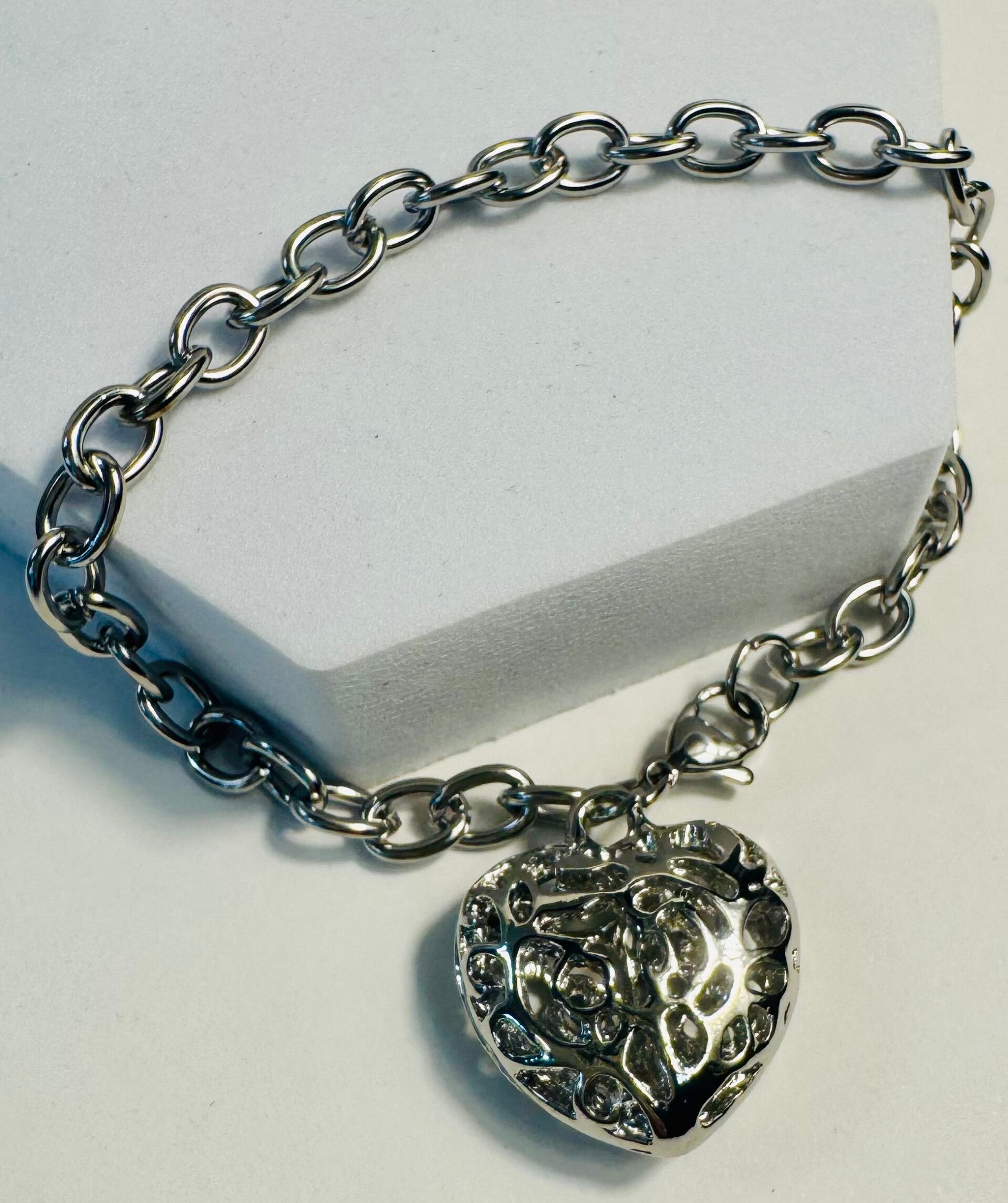 Elegant silver-tone chain bracelet featuring a detailed heart charm. The silver design adds classic shine and pairs well with any outfit. Comfortable link chain with secure lobster clasp. A versatile, feminine accessory in silver.