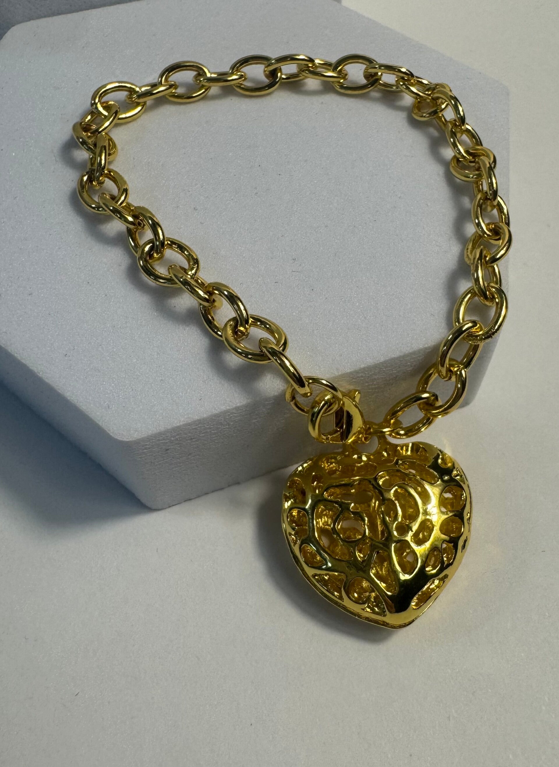 Elegant gold heart pendant necklace for women. Polished gold-tone chain with a textured heart charm. Designed to add a sophisticated accent to any outfit.